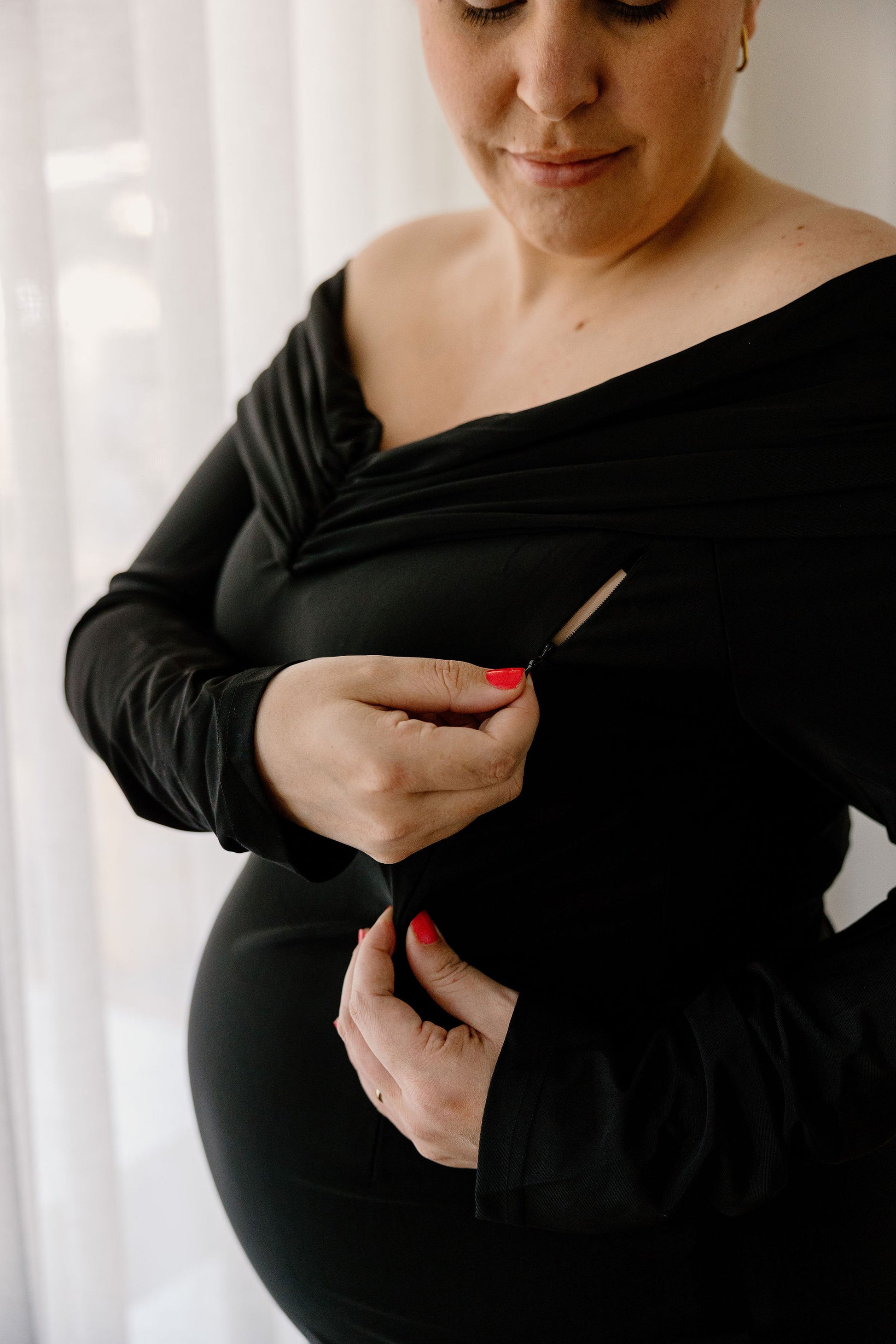 Introducing the Elora dress from On Demand Boutique – the perfect blend of elegance and functionality for breastfeeding and pregnant mothers. This stunning black, off-the-shoulder, long-sleeve dress is designed for special occasions like weddings and formal events. The fitted silhouette flatters your shape (including bumps) while discreet zips at the front provide easy feeding access. With a back zip for convenience and stylish gathering at the wrists, the Elora dress ensures you feel comfortable, confident, and beautiful.